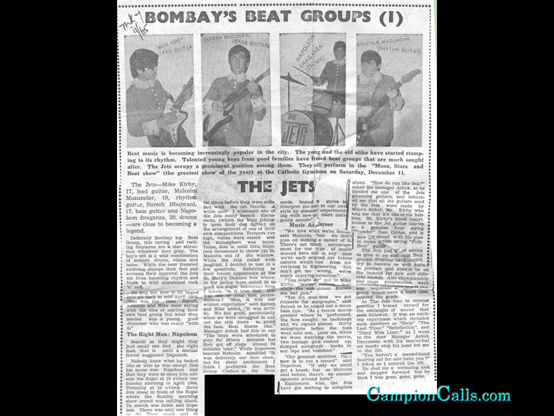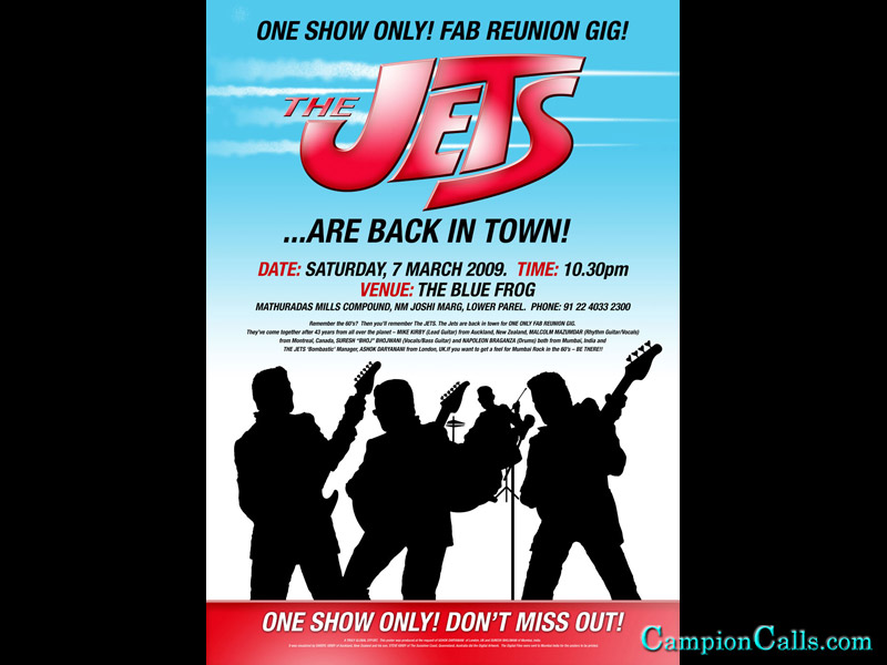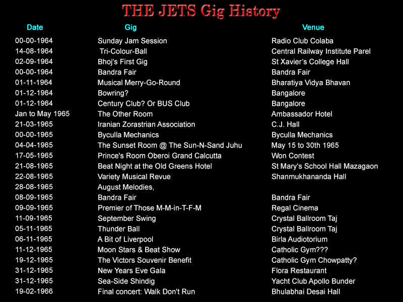 The gigs began - Saturday nights at The Taj and the The Ambassador. They performed at all of Bombay's top restaurants and auditoriums including the grand Sharmukananda Hall. Their fame and popularity spread and soon The Jets did gigs in both Pune and Bangalore. However their greatest tour was to Calcutta where they performed at The Grand Hotel, Calcutta during the vacations for a whopping Rs 3,000 with boarding and lodging thrown in.